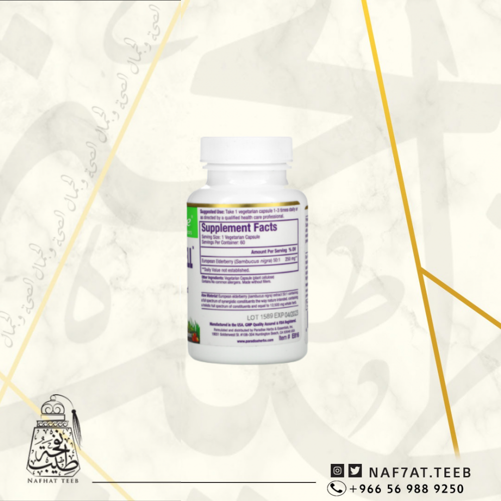 مستخلص الخمان الأوروبي (سامبوكوس نيجرا) بنسبة 50: 1 يحتوي على مجموعة كاملة من المكونات التآزرية بما يعادل 12،500 ملجم عشب كامل