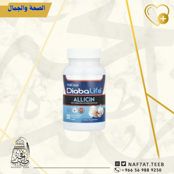 مكمل غذائي - تحتوي كبسولة DIABALIFE 450 ملجم على 125 ملجم من مسحوق الأليسين المستقر بنسبة 100%، بالإضافة إلى الخلاصات الطبيعية الفريدة الأخرى في تركيبة DIABALIFE التي قد تحسن مستويات الجلوكوز في الدم عند اتباع أسلوب حياة صحي.